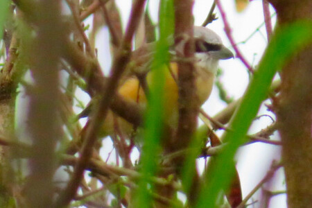 頭がグレーのモズの仲間にはチゴモズというものがいるらしいけど、アカハラっぽいお腹の色味はチゴモズの特徴ではない。