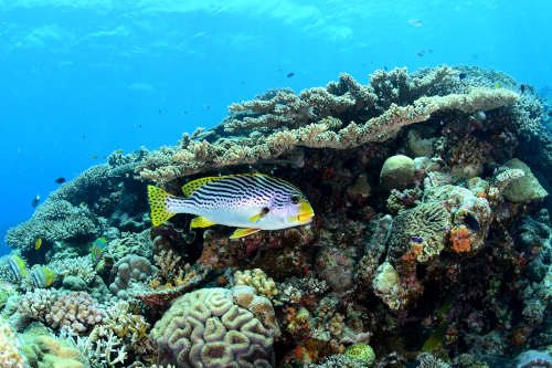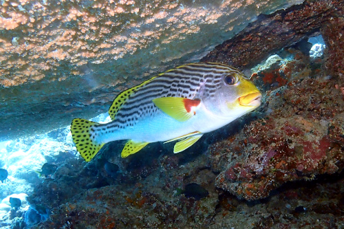 日中はサンゴの下でのんびりしていることが多いアヤコショウダイ。