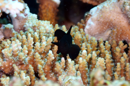 あいにくその周辺の散歩(採餌)に適したテーブル状のミドリイシが死んでしまっているために、彼らの姿を観ることができるのは、もっぱら枝状サンゴの枝間だけになっている。