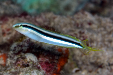 クロスジギンポは、リーフ際から始まる死サンゴ礫混じりの砂底でよく観られる。