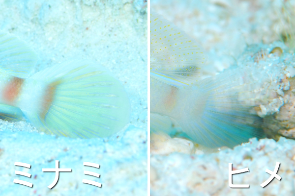 本文中で紹介している目の下の垂線の有無による見分け方は、水納島のように砂底が白いと薄くなってしまうことが多いため、ミナミダテハゼであってもパッと見は線が無いように思えてしまうこともあるという弱点がある。