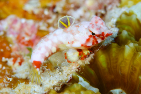 水中では赤色が吸収されてしまうため、肉眼で観ていると、ミヤケテグリはただの地味な小さい魚でしかない。