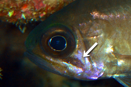 目の下の模様からして、これがナミダテンジクダイの仲間であろうことは間違いない。