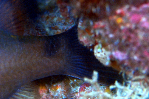 リーフ際のオーバーハングの暗がりに単独でいたというそのテンジクダイには、目の下から斜めに伸びるハッキリした模様と、背ビレと尾ビレの間に薄らぼんやりした黒い模様が見受けられる。