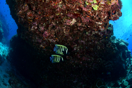 タテキンやサザナミが単独でいることが多いのに対し、ロクセンヤッコは仲良くペアで行動を共にしているほうが圧倒的に多い。