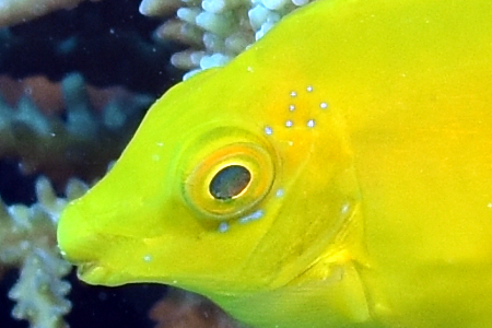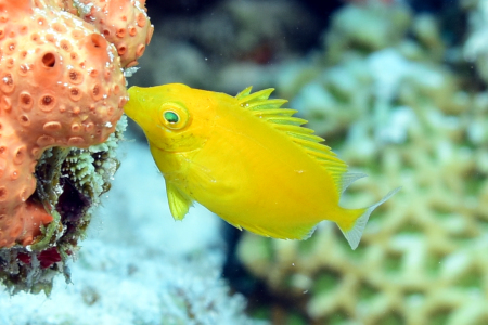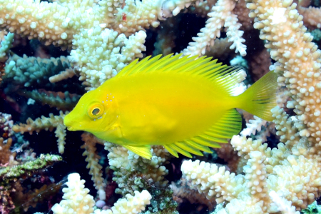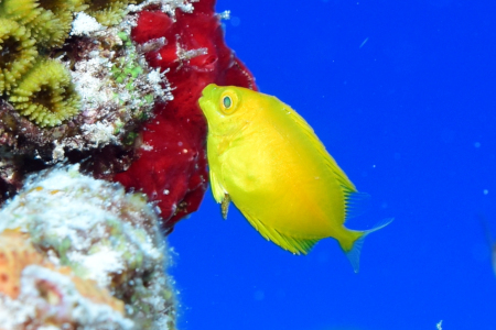 3cmほどの小さな黄色い魚が目の端でウロチョロしていたときにはネッタイスズメダイかと誤解していたんだけど、なんかネッタイスズメダイの動きじゃないっぽい…と注視してみたらば、それはまさかのイエローラビットちゃん。