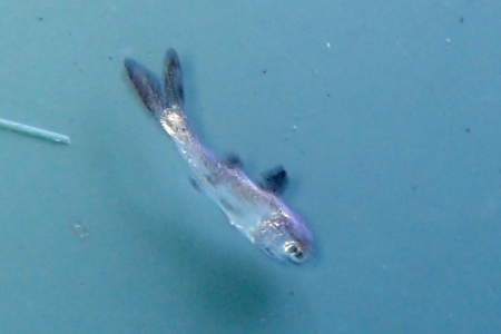 冒頭の画像に写っているバケツの目盛りが幅1cmだから、せいぜい3cm弱のこの魚は波打ち際の砂底に佇んでいたそうで、網ですくえたというからにはその動きは緩慢だったのだろう。
