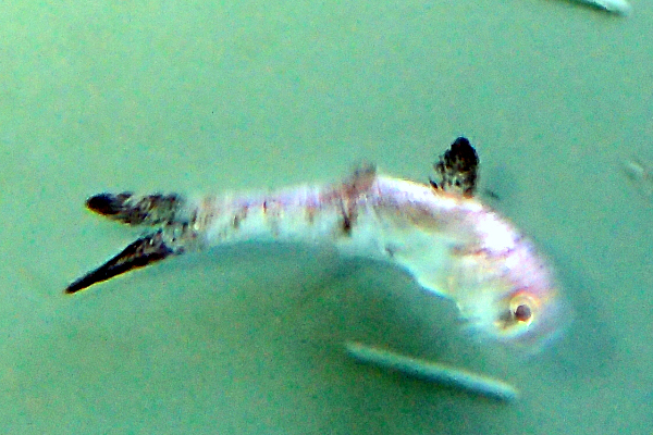 両者はそっくりなので、この程度の証拠写真で区別なんてできない…と思っていたところ、後日巨匠に伺ったところでは、上から見た場合ナンヨウアゴナシの胸ビレは透明なのに対し、ツバメコノシロは黒いという。