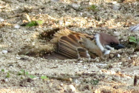 砂浴びをしているうちに自然とそうなるのか、そもそもそれが目的なのか、自分にピッタリサイズになった窪みに体を納め、それまで日が当たって暖められている地面でポカポカと暖をとっているようにも見えるスズメたち。