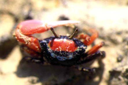 背中の色柄は個体ごとに違いがあるものの、総じて大きなハサミ脚は必ず赤い。