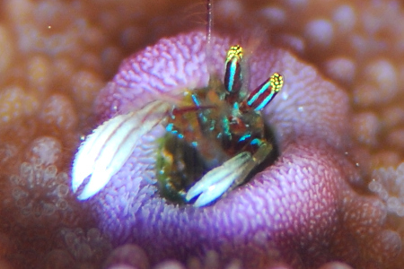 彼らはヤドカリには欠かせないはずの貝殻の定宿(?)を持たず、サンゴに穿たれているせいぜい直径5mmほどの穴を住まいにしているのだ。