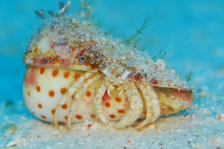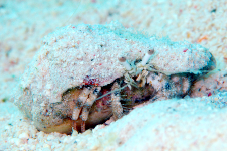 ヤドカリとしてはさほど注目を浴びることもないにもかかわらず、ダイバー由来の災難の頻度はなにげに高いテナガヤドカリ。