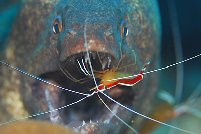 オトヒメエビは気ままなクリーナーなので、滅多にその気になってくれない。彼らがウツボの口に乗っかっている姿を観る機会は少ない。 ところで、昨日今日とたてつづけに灯台付近に潜ったところ、ふと気がついたことがある。