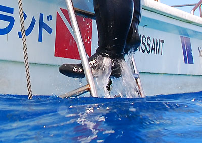 汚水垂れ流し中!! 彼はそれを、エキジット時に海水を襟元から大量に取り込み、小さな水もろとも一気に足元から流し落とそうとされているのだ。 この「儀式」、船上から眺めている分には人畜無害ながら、コスゲさんの直後にエキジットしようとしている人間にとっては、極めて有害な事態になる。 え? そう、こんな写真を撮っている私は、かなりの確率でコスゲ菌に毒されてしまっていると思われます………。 コスゲさん合宿中にご一緒になられたみなさん、彼よりも先にエキジットされることを推奨いたします。 |