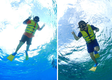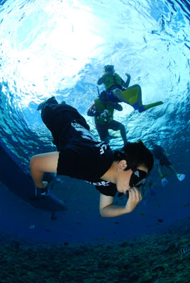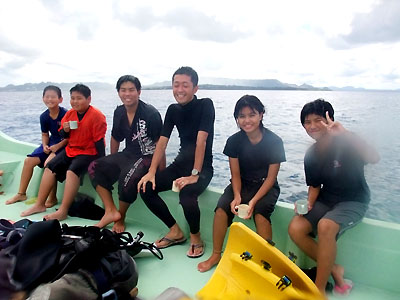毎年一度は、島のキッズを海に連れて行こうと思っているのだけれど、残念ながら昨年は果たせなかった。 夏休み中なのだから、毎日いつでも都合がいいはずだろうと思うのは甘い。島の小中学生たちは毎日忙しいのだ。 その「都合がいい日」が先日の日曜日。 さて、そんな島のキッズたちのうち、リョウ、アカネ、アスカの三人は、過去にも連れて行ったことがあって、3人ともジャケットをつけずに素潜りして遊ぶことができる。 5年生と4年生だというのに、島に住んでいるというのに、これまでマスクを使う機会がなかった?? ちなみに、彼ら小中学生がなぜ夏休みなのに都合がつかない日が多いのかというと、ほかでもない、週に3日くらいの割合で学校に行かなければならないからだ。 夏休みだというのに毎日のように学校に行かなきゃならないというだけで、僕などすぐにでも発狂してしまいそうだ。 それは百歩譲るとしよう。 そこには安全上の問題やらなにやら、リスクを冒したがらない公務員のしがらみがあるのかもしれない。 ようは「やる気」の問題なのだ。 さて、そんな次第でマスクとスノーケルを使ったことがないユウキ&リキだったのだが、そこはやっぱり子供のこと、あっという間に順応(最初はかなりてこずったけど…)。 そして………