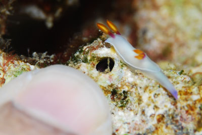 肌色部分はワタシの人差し指 こんなに小さいものは夏場ではなかなか見られない。 珍しくないといえば、この季節のこのウミウシ。