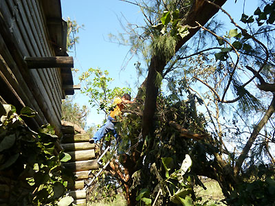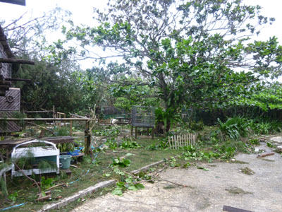 チェーンソーを手に、大木を切り落としてくれているコーラルのヤスシさん。 撮影:オタマサ その進撃速度にリンクしていたのか、今回の台風は南東の風が尋常ではなく凄まじかった。 だから他のみなさんの家ではいつにも増して、台風後の後片付けの際に、倒れたり折れた樹木を撤去する量が多かった。 それでもやはり、連絡船が復旧する前の1日だけでほぼすべて終わってしまうのだからスゴイ。 いいお天気のときに島に来て、「いいところですねぇ…」とため息混じりに住みたそうに言うお客さんはけっこう多いけど、遊びに来るだけならともかく、「住む」のであれば、こういうことも踏まえておかないといけないのはいうまでもない。 そんなこんなで、まだ渡久地に避難させてある船の無事を確認してはいないものの、とりあえず家も我々も健在です。 台風のたびに折れては家を壊す防風林って、いったいなんなんだよ………。 ところで。 これくらいモノスゴイ台風が来たあとは、さすがにもう今年の台風はこれで最後だろう的、一難去った安堵感ってのがあるんだけど、それは8月とか9月の話。 5月でここまでスゴイ台風、これが7月、8月、9月になったら、いったいどういうことになっちゃうんだろう?? クロワッサンは、生き延びることができるか?? |