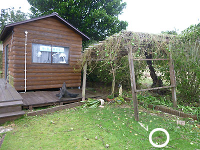 丸印のところが、手前の柱の本来の位置。 あわや雑貨屋さんに激突するところだった……。 メイクマン製束石の羽子板の腐食により、我が自信作のパーゴラ君は根元から吹っ飛んでしまったのである。 さてさて、肝心の我が家は??