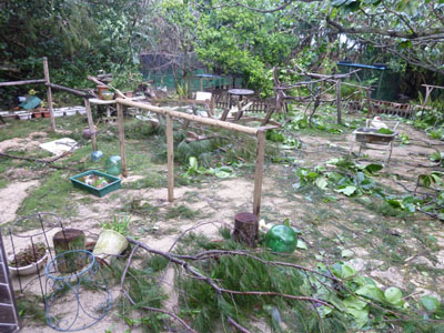 防風林のモクマオウの大木が、真ん中から真っ二つに裂けて両サイドに倒れている!! で、その片方が屋根の端を直撃!! 南東の風が強そうなので、アネックスにいるよりも母屋のほうが安全かも…と考えて1人家に残っていたうちの奥さんは(たしかににアネックスはやばかった……)、さすがにこの大木直撃の音にはたまげたそうな。 家自体も大木の衝撃には耐えかねて、屋根の端っこは割れてしまってはいたものの、あの暴風を耐え切って、なお雄々しく建っている我がボロ家。 築20年のボロボロのおうちにもかかわらず、毎年本格派の台風が来るたびにこれで最後だと覚悟を決め続けているにもかかわらず、被害がこれだけで済んだなんて、まさに奇跡に近い…。 ひょっとして我が家って、全身がサイコフレームでできているんじゃないだろうか?? さてさて、パッと見ると手のつけようがなさそうに見えるこれら台風の爪あとも、午前中のうちにこのとおり。
