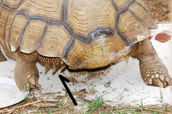 ……この姿を大城のおばあに見せてあげたい。 ところでこのガメラ105号君が「ケヅメリクガメ」という種類の陸カメだというのは周知のとおり。 と思っていたら、さすがに当然蹴りワザはないものの、彼の脚の付け根にはこんなものが。