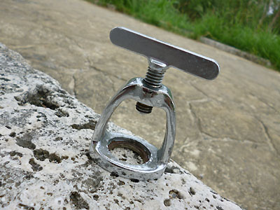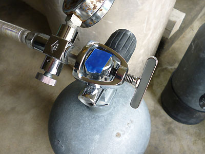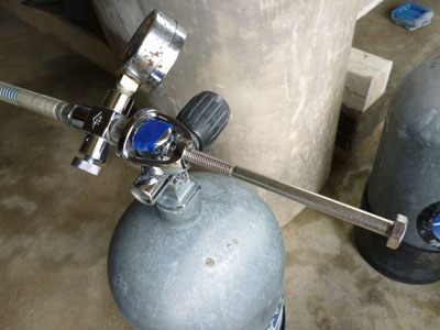 ※写真を撮るために装着しているだけなので、水桶には入れていません。 まぁ早い話、レギュレーターをつけるのと同じようなものね。 そのネジネジ君のネジ山が、すっかりバカになってしまっていたのである。 うーん、このネジがないとチャージができない。 ともかくこのネジネジ部分を手配すべく、普段世話になっているダイビングよろず裏方業務の老舗に連絡したところ、なんとも幸いなことに、その日北部まで品を届ける便があるから(お店は北谷にある)、今日のうちに届けられる、とのことだった。 とはいえそれまでの間もチャージしておかないと、このお盆商戦後半を乗り切れない。 その時フト閃いた。 祈るような気持ちでメイクマントイレからある物を取り出し、チャージ小屋にて試してみた。 そのある物とは……