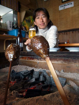 このしんごろうというのがなかなかいける食べ物で、蒸したうるち米の上にじゅうねん、すなわちえごまの味噌を塗ったくってある。それを炭火でちょろっと炙ると、これがまたえもいわれぬ絶妙な味に。 我々のあとに、栃木からいらしたらしい年配のご夫婦も来店してきた。彼らはどうやらそのあたりを散策して、蕗の薹などを物色していたらしい。