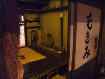 二十数分サイクルで1日を表すよう照明が変わるこの長屋スペースには、八百屋や船宿といったおなじみのお店を始め、そこに住まう人ごとに変わる長屋の部屋の中なども大変凝っていた。