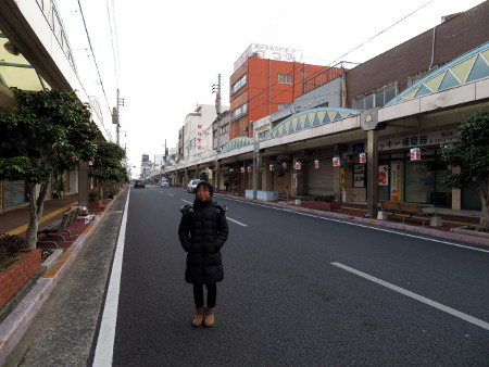 ホテルから出てすぐのところに、この市街地の中心を占めるといっていい商店街のアーケード通りがある。 先ほど乗ったタクシーの運ちゃんいわく、郊外に大きなショッピングモールができて以来、すっかり寂びれてしまったのだとか。 観光立地的には、やりようによっては那覇の国際通りのようにできそうなものなのに、もったいないなぁ……。 でも我々がいたこの時期は、毎年恒例の五島椿まつりの期間中で、アーケードには箱型提灯(?)がズラリと並び、ほんの少しにぎやかにはなっていた。