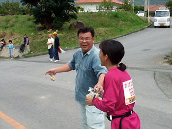 約束どおり、バナナを手渡してくださるえび屋− Mさん。それも、ご丁寧にも皮が剥かれた状態で。 皮が剥かれた状態のバナナが入ったビニール袋、というのは、冷静に見るときっとなかなか強烈な姿だったのだろうけれど、9時からお昼抜き状態で走っている我々には、貴重な栄養源以外のナニモノでもなかった。 ビニール袋にはバナナのほかに、ロイズ石垣の黒糖チョコまで。 これなら、たとえ山で遭難しても3日は生きられる!! この 28キロ地点通過時の様子の写真を当サイト掲示板にて実況中継つきで紹介して下ったのがえび屋−Mさんで、その写真がこれ。