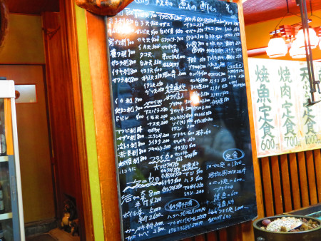 案内された席は、レジに一番近い場所だった。 これが実はとってもラッキーだったのだ。 というのも、各種定食や定番はテーブル上に置かれているメニューで確認できるけれど、水揚げ状況、仕入れ状況でその日ごとに変わる本日のメニューは、レジ前にあるこの黒板でしかわからない。