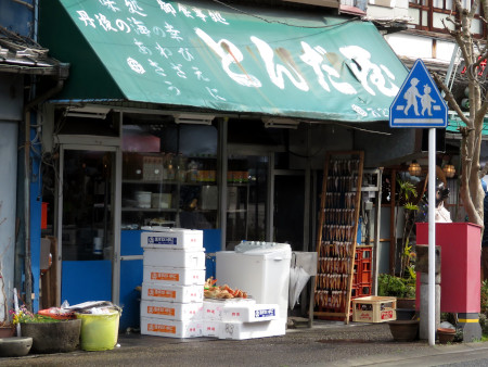 帰りは午後3時4分宮津発のはしだて6号に乗る予定だったから、ともかく時間はたっぷりある。 富田屋さんの厨房スペース入り口には、ハタハタと思われる魚が干されているほか、無造作に越前ガニやマグロがドテ…と置かれてあったりして、海幸の無尽蔵ぶりがうかがえる。