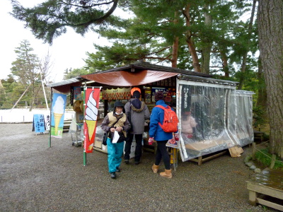 そのため、いかにも観光地にありそうな昭和な茶店が、むしろ際立った存在になっていた。 我々が通りかかった時には他にお客さんがおらず、濡れていないベンチを利用できそうだったから、休憩がてら甘酒でもいただくことにした。 冬の散策で疲れた体には、甘酒が人生的に正しい選択なのである。 注文すると、人好きのしそうなオジサンがストーブの傍の腰掛けに案内してくれた。 奥で甘酒が準備されている間、そのオジサンと話す。 すると驚いたことに、そのオジサンはやたらと現在の沖縄の時事モンダイに詳しく、まるで沖縄タイムスか琉球新報を普段から読んでおられるのではないかとさえ思ったほどだ。 だって、就任間もない沖縄県知事の名前や知事が抱えているモンダイなんて、内地の方がとっさに言えます?? 挙句の果てには、基地の負担は沖縄だけに任せるのではなく、日本全国で分け合わなければらないという論調で熱く語っておられた。 県民としてはとてもありがたいその政治信条、いったいこのお店は?? と不思議に思っていると、甘酒が出てきてしばらくした頃に、 「じゃあ、行くわ」 と、奥にいた女将さんに告げるオジサン。 「あら行くの?」 「うん」 なんてやりとりのあと、オジサンはサササとどこかに行ってしまった。 あれ? あの方、お店の方ですよね? 「ううん、でもああしてたまに手伝ってくれるのよ」 ええッ??? だって、我々がいる間に訪れたアジアン女性の応対も、「何言ってんだかわかんないんだけどね、ハハハ…」なんてあとで言いながらも、ちゃんとしてましたよ、あのオジサン…。 なんとも素敵なこのノリ。 奥にはご主人もいらっしゃった。 まさか兼六園の茶店で、そんな昔の沖縄をご存知の方とお会いできるとは思いもよらなかった。 ちょっぴりファンキーなご主人によるとこの茶店の歴史は長いらしく、話しぶりからすると二代目店主のような雰囲気だった。 そこで不思議に思うことが。 そんな兼六園で昔から茶店を出している方って、いったいどういう力と権利を持った存在なんだろう??? ひょっとして、とある知られざる世界のゴッドファーザーとか。 ……なんてことを思い浮かべつついただく甘酒は、歩き疲れた体にとても優しく、そして深く染み渡る。