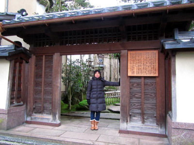 大野庄用水から取水された曲水が庭を流れ、落水まで設けられた流れは再び用水に戻るように作られているそうで、様々な形の灯篭、そしてそれらの絶妙な配置と建物との調和が、欧米の方々の琴線に触れたのだそうな。 庭には樹齢400年の木々があったりして、歴史もしっかり兼ね備えている。 百万石ご家中の千石取りの屋敷にしては、狭くね?? これを書くにあたっていろいろ調べてみたところ、実はここ、たしかにかつての野村家の屋敷跡ではあるんだけど、明治後には土塀と庭の一部を遺してすべて取り壊され、菜園になっていたというのだ。 加賀藩の支藩である大聖寺藩の豪商がどこぞに建てていた藩主接待用の豪邸の一部をその跡地に移築し、屋敷としての体裁を整えてあるのだとか。 それってつまり、いつできた誰の家ってことなんですか?? なんだかよくわからないけど、とにかく屋敷自体は家臣の野村さんとはなんの関係もないらしい。 つまりミシュラン二ツ星という庭も、かつての野村家の屋敷にあった一部であるに過ぎないってことでしょ?? なんだよ、すっかり誤解していたじゃないか。 ……と思ったら。 立派な門構えの入り口に詳しく書かれていたのであった。