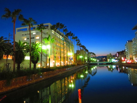 上流側も下流側も、ここはどこ?ってなくらいにヤシ(ワシントンヤシモドキ?)が並んでいる。 五島でもそうだったように、南国ムードを演出するにはヤシの木が欠かせないのだ。 そのままさらにまっすぐ行くと、突き当りにあるのがこちら。