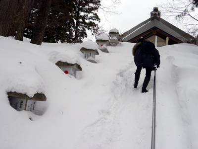 山門(?)まではそこから左右へ続く道があるからか掃き清められているものの、その先は階段がすっかり雪に埋もれていた。 それが2〜3メートルならなんとかなるかもしれないけど、階段はまだ何十段も続く。 さすがにこれじゃあ、神社まで登れないなぁ。 女将さんに伺ったところによると、お正月に神社にお参りするときだけは雪掻きされるものの、さすがに冬季は恒常的に階段をキープしていられないという。 というわけで、温泉神社は残念ながら………… ……と思っていたら!! 盃湖から続く道をテケテケ歩き続けていると、なんとこの階段を登りきったところに出てきたのだった。