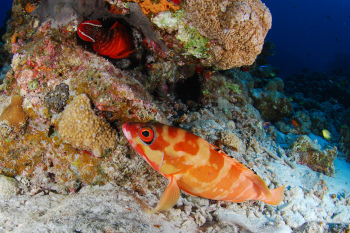 リーフ際などではニジハタと生息場所がかぶるアカハタは、ときにはこのように食べ物を奪い合うこともあるようだけど、基本的に両者は互いを尊重しており、いがみ合っている様子は見られない……