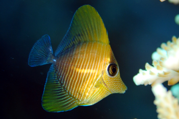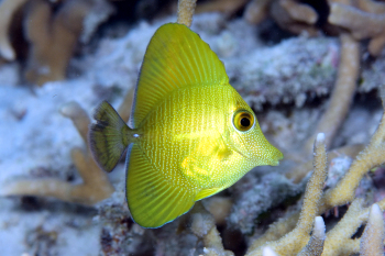 リーフの外ではなかなか出会う機会がないヒレナガハギの幼魚とは違い、ゴマハギの幼魚は、夏場を迎える頃からリーフ際のサンゴの枝間でよく観られるようになる。