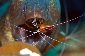 根に落ち着いたゴマウツボは、他のウツボたちに比べるとかなりの頻度で、エビや魚にクリーニングケアを受けている。