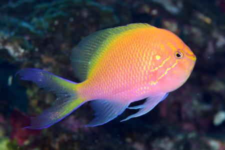 他のハナダイ類と違って、中層で群れ泳ぐわけではなく、岩壁すれすれをヒラヒラしながら、危険が迫ると…つまりダイバーが近づくと、岩陰に隠れてしまう。