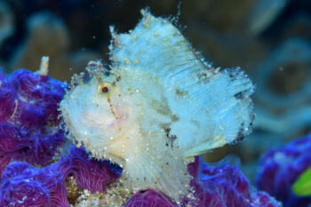 ご丁寧にもイソバナのポリプと同じ白色まで体に配してあるから、イソバナに群れ集う小魚たちは、プレデターであるこのハダカハオコゼの存在に気づけないに違いない。