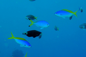 体型も体のブルーもウメイロモドキの雰囲気を醸し出しつつ、尾ビレの上下端にはタカサゴのような黒のチョンチョンがついているハナタカサゴ。