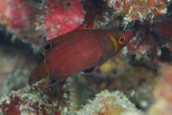 普通にファンダイビングを楽しんでいる方が、わざわざこのベラを探すためにオーバーハングの裏側にへばりつく必要性を100文字以内で述べよ、と言われても、書き出し部分で筆が止まること必至。