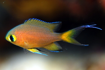 わりと地味めな体色ながら、猫目がとても印象的なヒレグロスズメダイ。