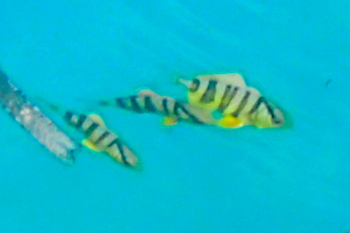 桟橋上から水面越しに無理矢理撮った、ヒレナガカンパチのチビターレ。