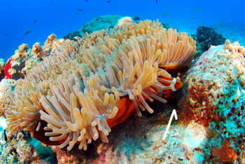 可愛いカクレクマノミを観たいなら、ペアに注目するよりも、より小さな同居人に目を向けるといい。