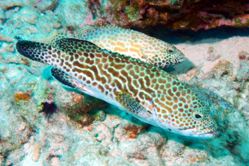 よく観るとこの時のカンモンハタのオスは、お腹のあたりに石垣模様がなく、白っぽくなっている。
