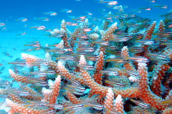 これくらいになると、枝サンゴの上で見応えのある涼やかな群れを見せてくれるようになっている。