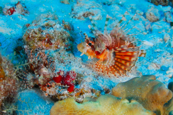 キリンミノはリーフの中でも普通に見られるし、砂地に点在するちょっとした小岩などでも見られるハナミノカサゴの仲間(でもミノカサゴ属ではなくヒメヤマノカミ属)で、それほど大きくはならず、パッと見は、特に若い頃は、ネッタイミノカサゴに似ている。