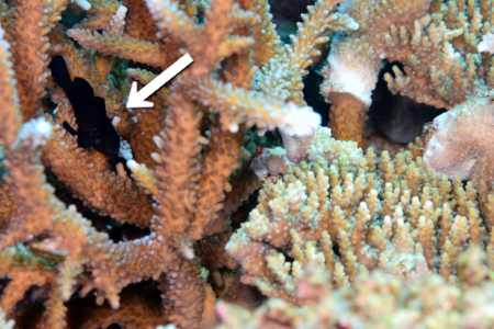 あいにくその周辺の散歩(採餌)に適したテーブル状のミドリイシが死んでしまっているために、彼らの姿を観ることができるのは、もっぱら枝状サンゴの枝間だけになっている。