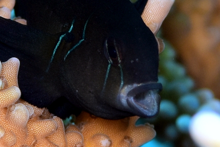 ただ、浅いところでいつでも会えるのはありがたいものの、よく見ると目元やエラのあたりのブルーのラインが美しいとはいってもとりたててカラフルというわけではなく、というかむしろ真っ黒クロスケなので注目度は限りなくゼロに近く、これまで「コバンハゼが見たい!」というヒトに会ったことはない。